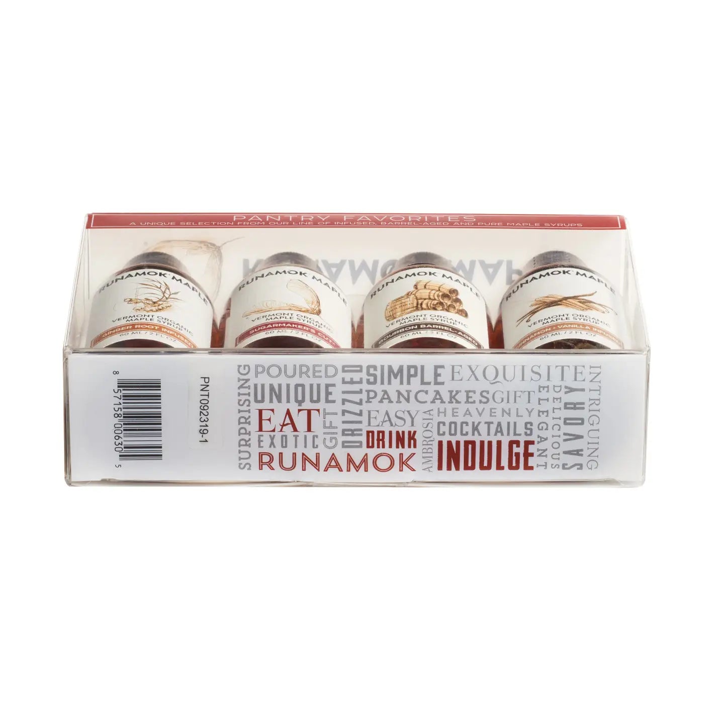 Pantry Favorites Collection: This collection is known as the All-Stars of Runamok. Packed in a certified 100% recycled PET box, this pairing collection makes for the perfect gift any time of the year. Featuring our most popular maple syrups, customers will find no shortage of ways to use these 4 delicious flavors, from pancakes and waffles to dessert toppings, beverage sweeteners, glazes, vinaigrettes and beyond. Contains: 60ml bottles of Sugarmaker's Cut Organic Maple Syrup, Bourbon Barrel-Aged Organic Maple Syrup, Cinnamon+Vanilla Infused Organic Maple Syrup and Ginger Root Infused Organic Maple Syrup.