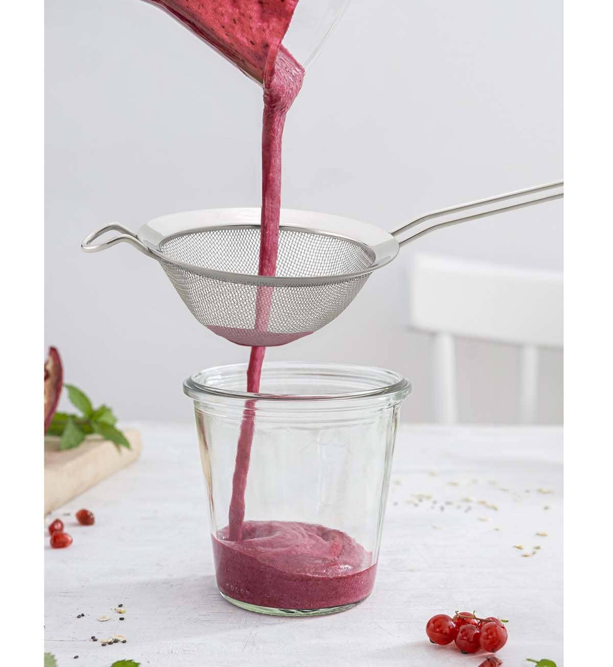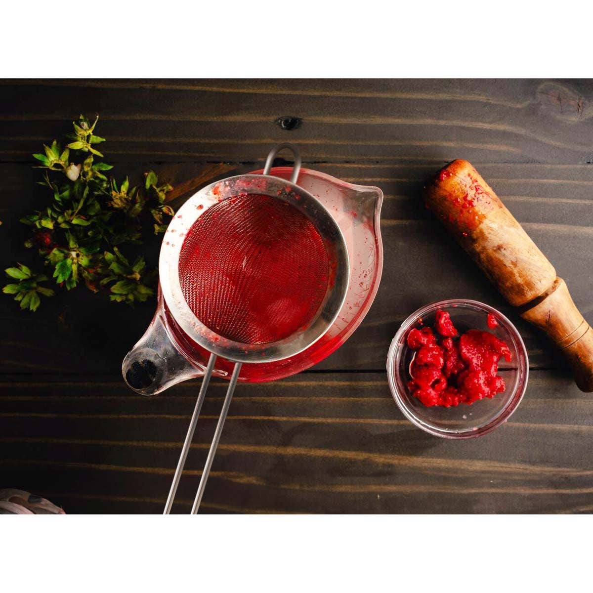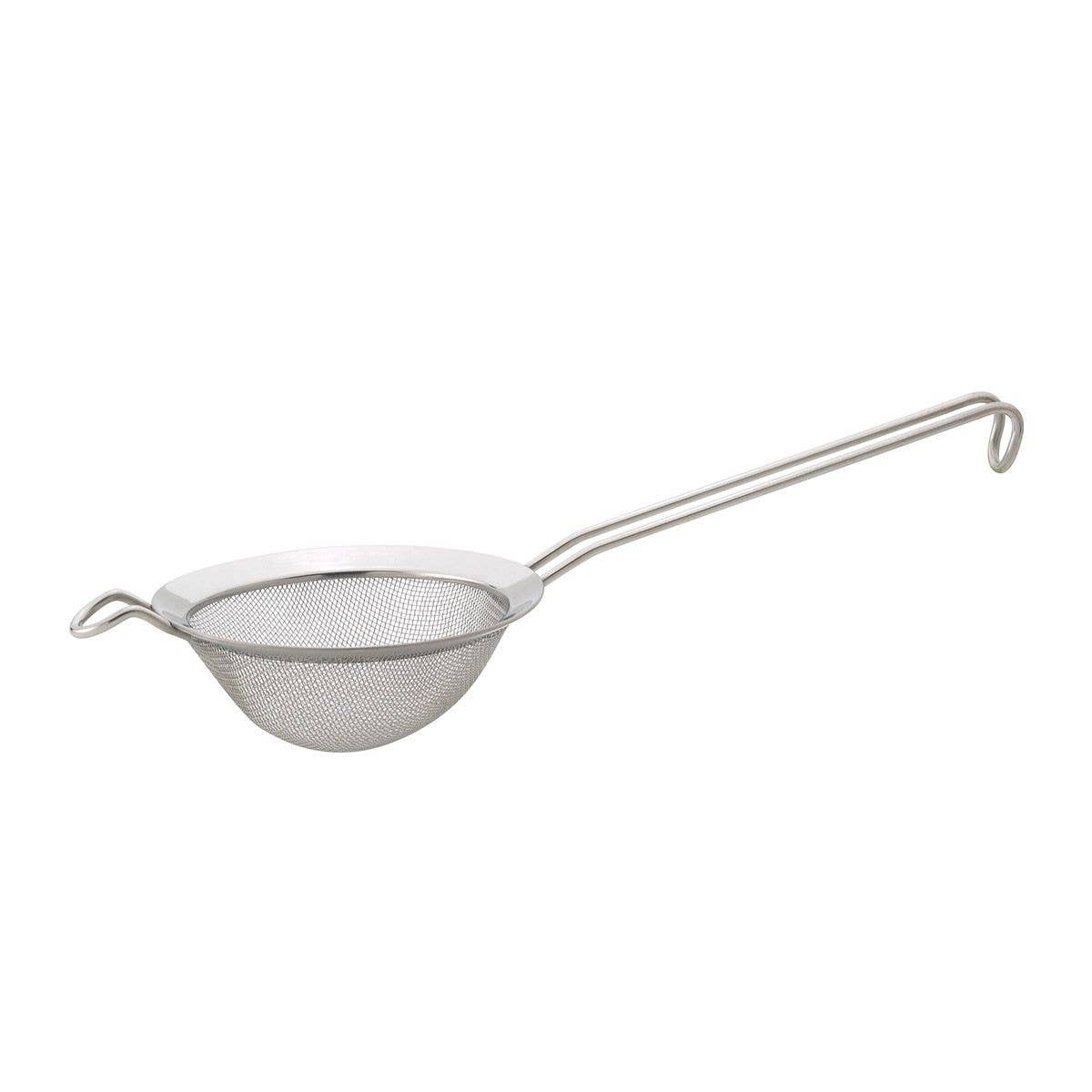 HIC Kitchen's Double Mesh Strainer drains, sieves, aerates, and sifts ingredients for smooth textures and fluffy baking without clumps or lumps. The helper handle sits securely on pots and pans, mixing bowls, and containers for extra stability during use so hands are kept free for measuring, pouring, and food preparation. The fine mesh sieve extracts seeds, skins, fibrous bulk, and small bits for smooth consistencies and creamy textures in soups and sauces, pastes and purees without lumps. This versatile food strainer and kitchen accessory rinses legumes, rice, and grains, catches seeds and pulp from fresh lemons, drains and strains herb infusions or mulling spices, and sifts flour, confectioners' sugar, and other powdered ingredients that settle and compact during shipping. Size: 5"
