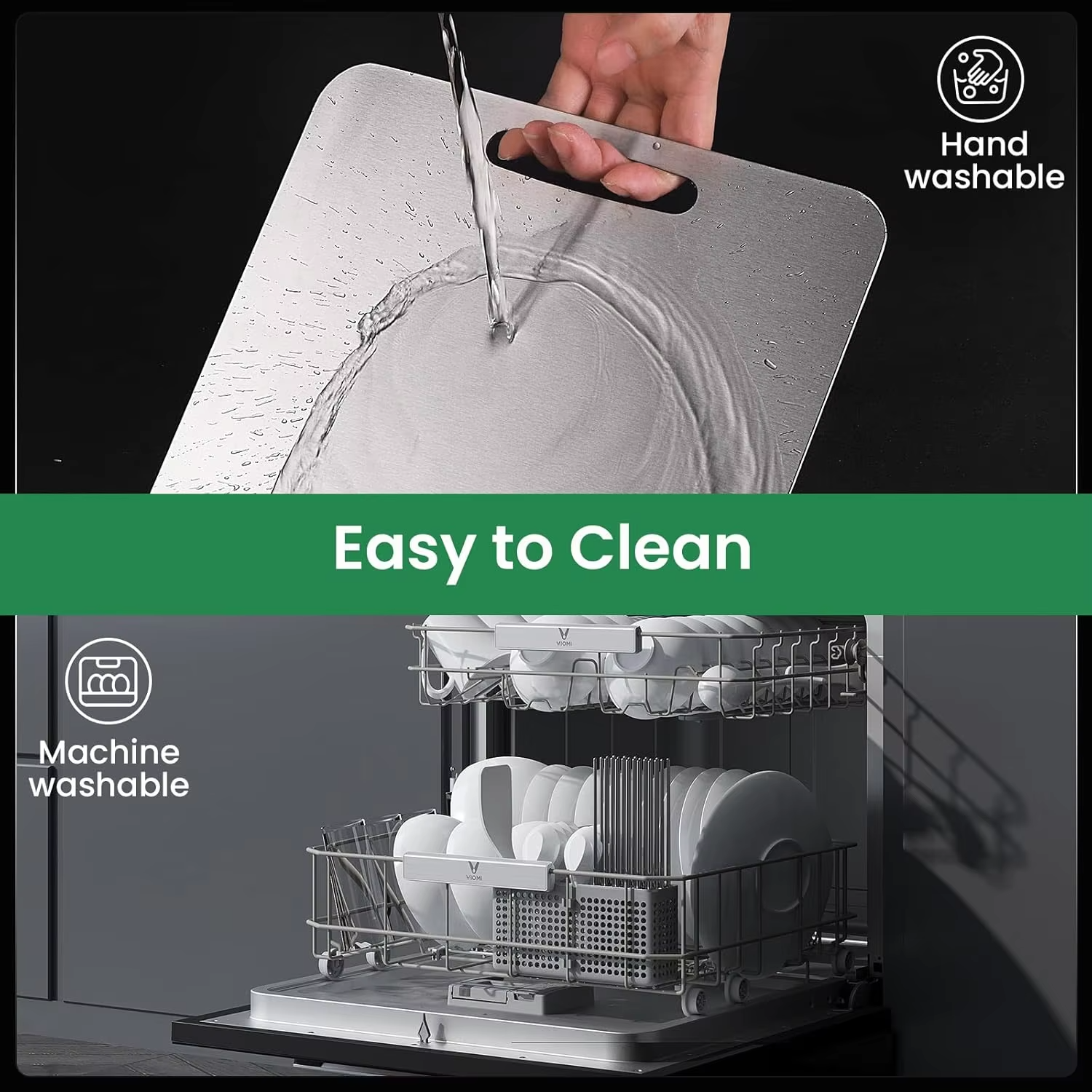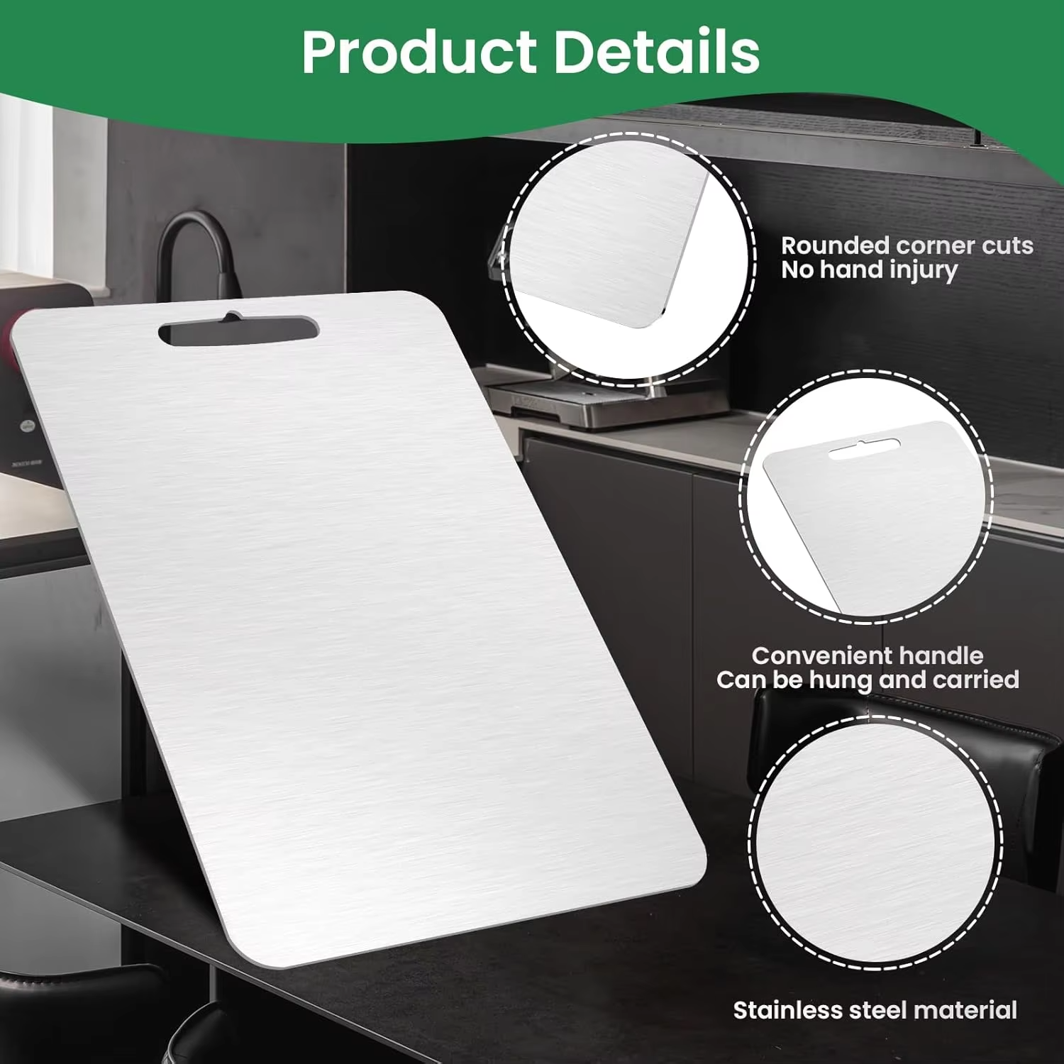 Sturdy and Durable: Titanium cutting boards are extremely sturdy and durable, resisting cuts, grooves and punctures. The ruggedness ensures that your cutting board is long lasting and smooth and hygienic. Remove the common defects of ordinary cutting boards, brand new design titanium cutting board. Durable and Crack-Resistant:Say goodbye to cracks and splits! The meat cutting board is built for heavy use, food and liquids won't stick to the surface, simply rinse with water, and it dries instantly Knife-Friendly Surface:Protect your knives with our dishwasher safe cutting boards! Its ideal hardness ensures smooth cuts while keeping your blades sharp and intact Stable and Versatile Design: Enjoy a stable cutting experience with our double sided cutting board. Its double-sided design helps separate ingredients, and the handy handle makes cutting board metal easy to move, store, and hang, keeping your kitchen tidy.