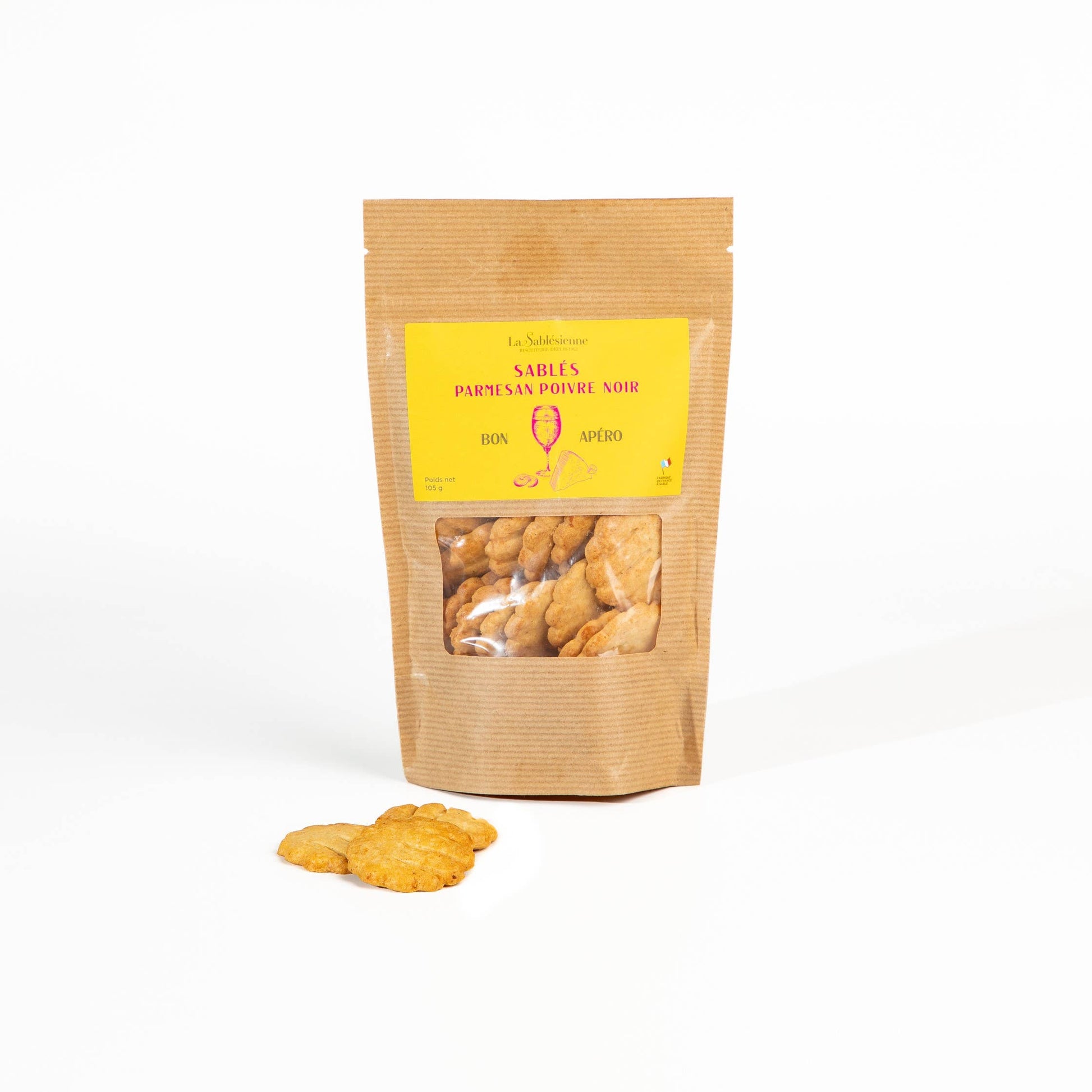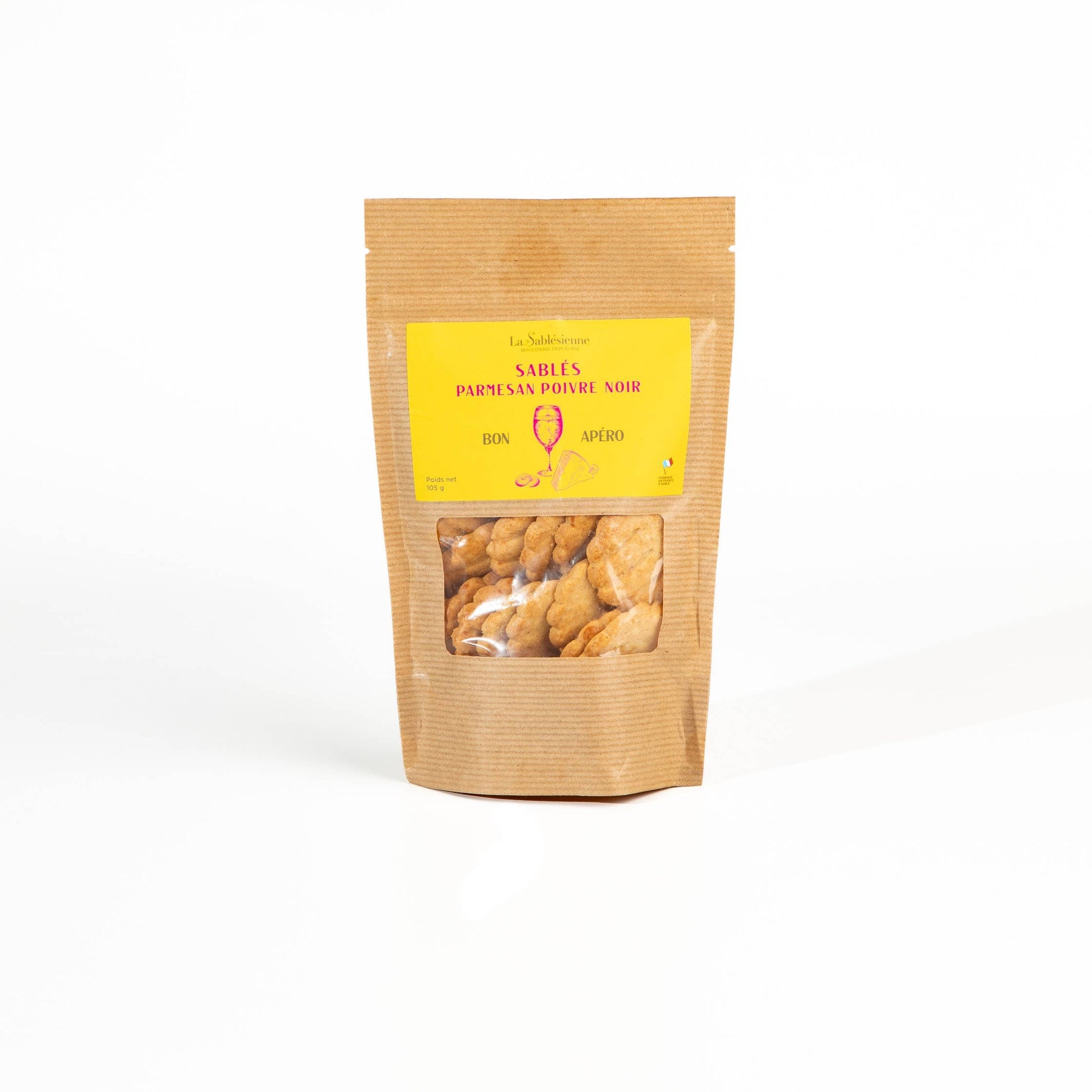 Delicious and savory shortbread to accompany your appetizers, here is the new range of delicious savory shortbread from our Biscuiterie! Discover this authentic recipe of PDO parmesan shortbread, combined with black pepper for a tasty balance. All these biscuits are handcrafted by the Master Pastry Chefs of La Sablésienne biscuit factory, who use noble and French ingredients, without coloring, preservatives, or artificial flavoring. Size: 105g