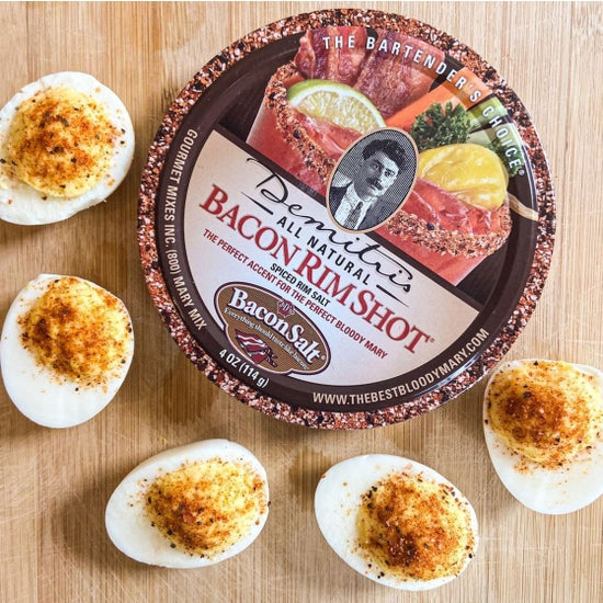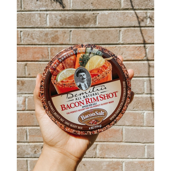 Bacon: Demitri teamed up with his friends at j&d's, makers of bacon salt®, to bring you "Bacon rimshot". A smoky, savory garnish that adds aroma and tons of flavor-great with a nice cold sip of a bloody mary!