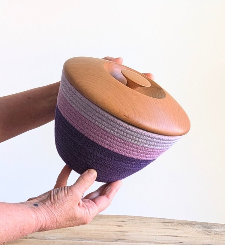 My husband, Chris, has joined me in the crafting of heirloom-quality wood lids, which are paired with our hand-dyed Rope Baskets. Each lid is created out of a solid piece of Walnut, Maple, or Cherry wood. I truly cherish this collaboration with Chris.