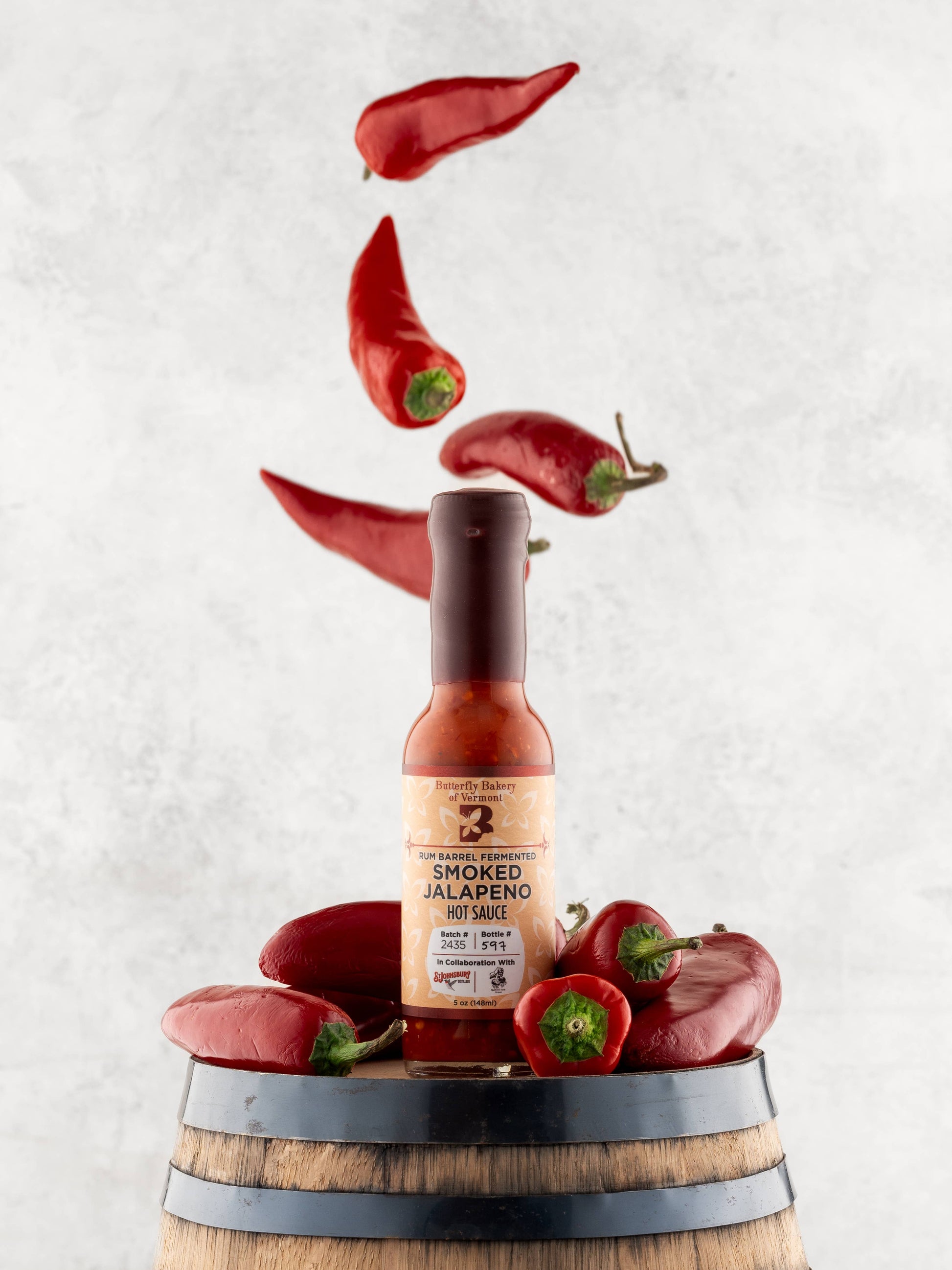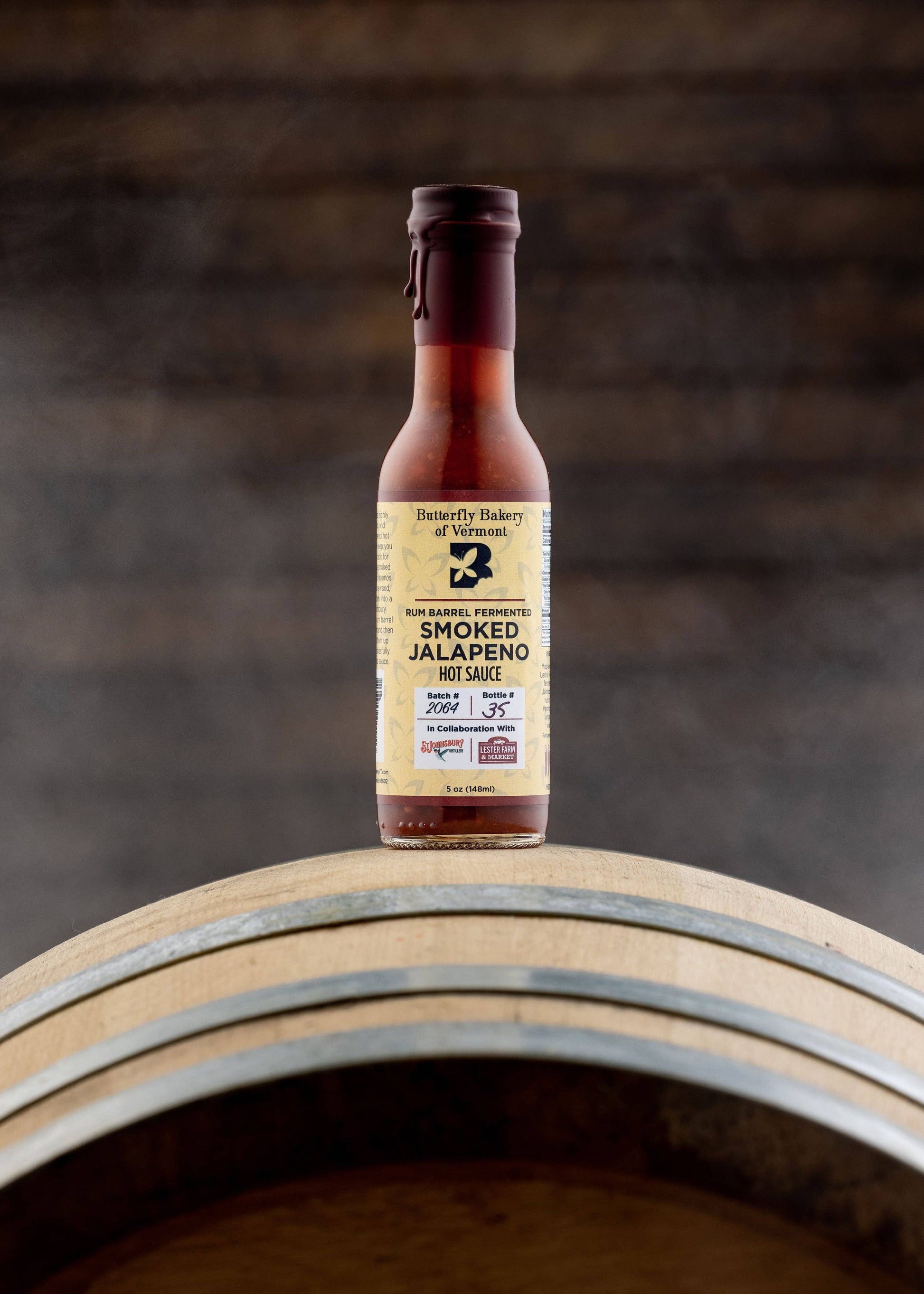 Rum Barrel Fermented Smoked Jalapeño Hot Sauce is a once-a-year limited and most-coveted hot sauce. Created with maple wood smoked Vermont red jalapeños that are mashed, brined and loaded into a St. Johnsbury Distillery Rum barrel to ferment. The fermentation process introduces a layer of complexity that complements the heat and flavor of the peppers, creating a sauce that is as versatile as it is distinctive. Butterfly Bakery of Vermont hot sauces are truly a farm-to-fork product. By working directly with small farms, to choose the specific pepper varietals that go into our award winning hot sauces. Hot sauces make excellent gifts and will kick your condiment game into high gear. Heat: 🔥🔥🔥