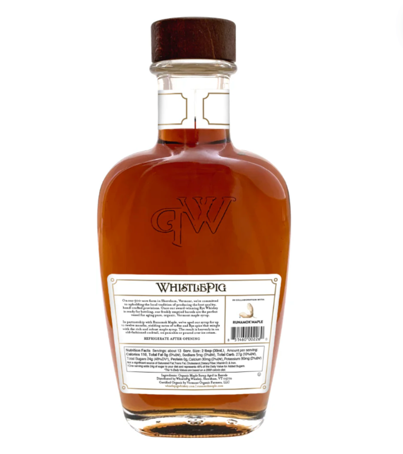 Runamok Maple is thrilled to announce their newest collaboration and new core product with the legendary distillers at WhistlePig. They combined two Vermont favorites by aging their pure maple syrup in WhistlePig Rye Whiskey barrels for 9 months and offering it in their iconic custom bottle. The result is a delightful syrup that's perfect for sweet and savory dishes, as well as cocktails.