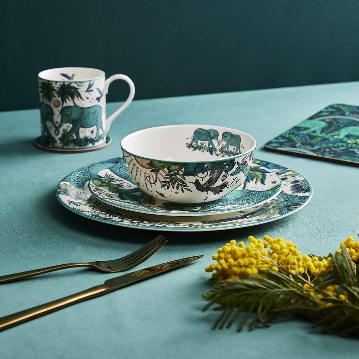 Twelve individual layers of colour have been used to build up the exquisitely detailed and colourful artwork on each piece with rich teals and tropical greens mixed with subtle, warm neutrals.