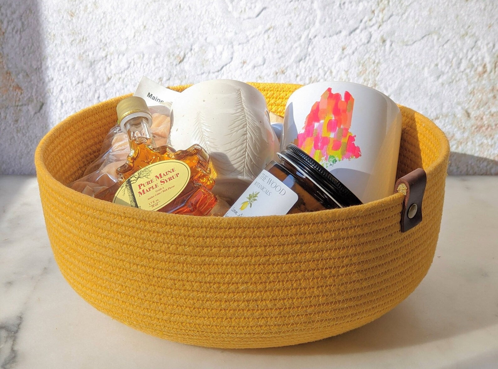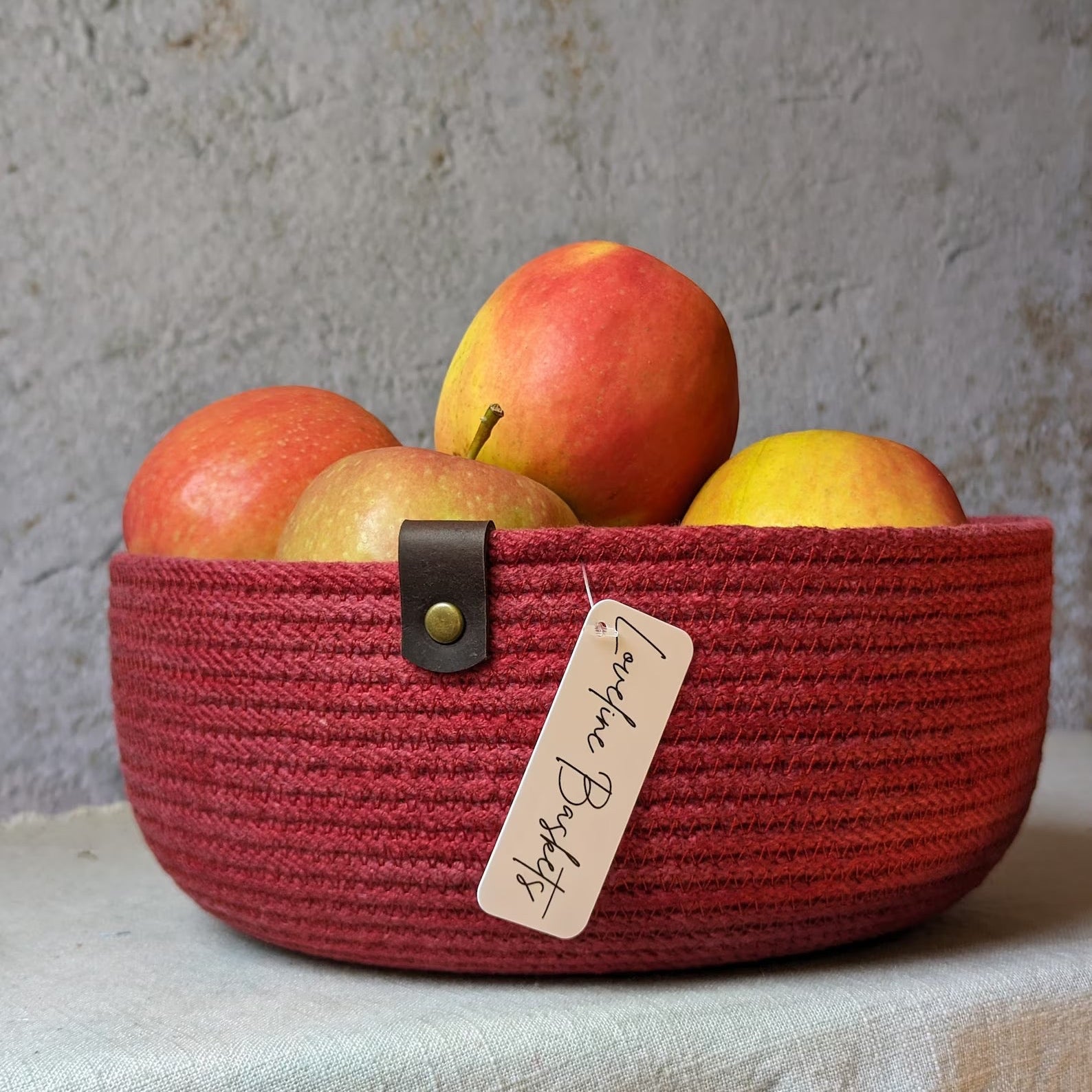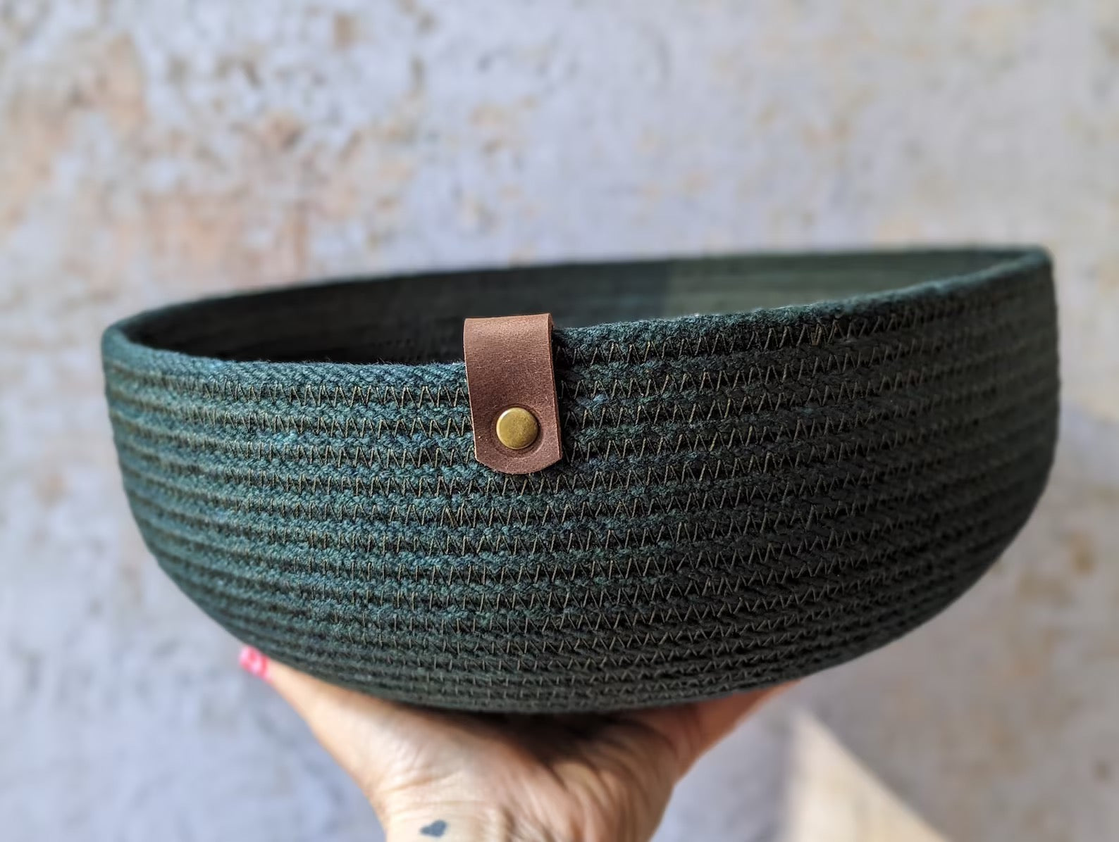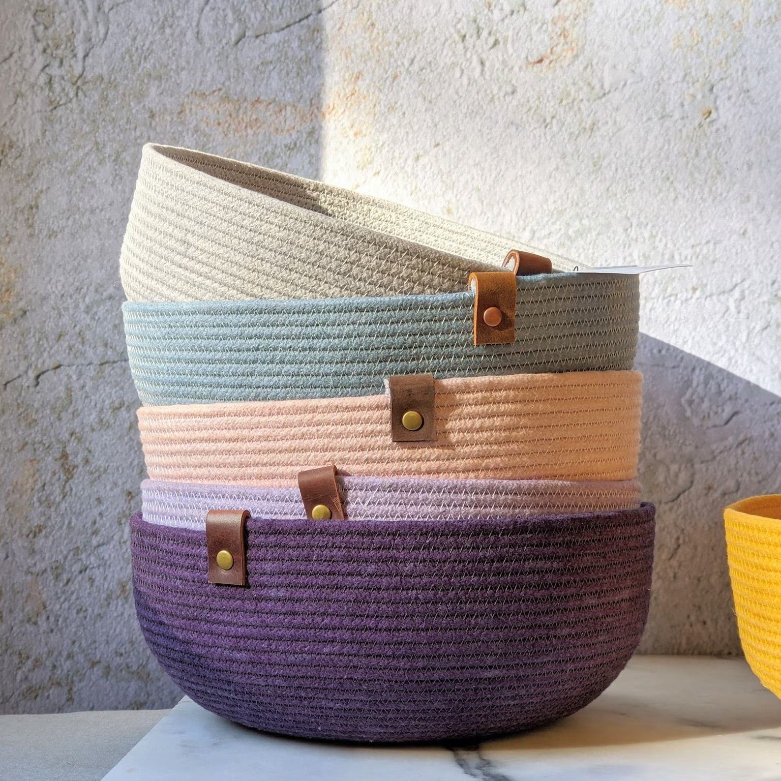 Loveline baskets are made using 100 percent cotton rope that is hand-dyed in small batches using eco-friendly dye. Loveline baskets are sewn free of form on an industrial sewing machine. Please allow for slight variations in size and or color. Each basket is finished with a leather tab and brass rivet.