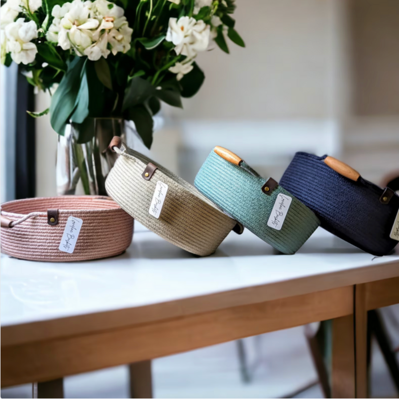 The Zinnia Rope Tray has beautiful cherry wood handles. The Zinna Tray comes in multiple stunning colors.