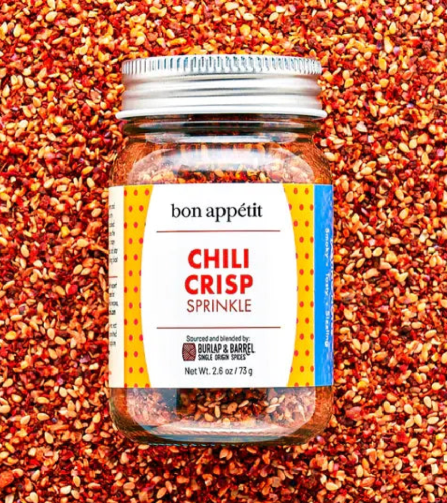 Chili Crisp Sprinkle is a smoky-sweet twist on Chinese-style chili crisp. Imagine the palate-warming heat and toasted-allium intensity of chile crisp, turned into a dry seasoning blend for dusting over everything from cooked meats to stir-fried or blanched vegetables. It combines the mellow heat of silk chile, earthy umami from ground crispy shallots, and faint toasty aromas from smoked paprika and star anise. Benne seeds provide extra bite, creating a finishing blast of texture and flavor. Ingredients: Shallot slices, silk chili, benne seeds, smoked pimentón paprika, panela cane sugar, smoked star anise. Contains: Sesame Cooking Tips: Serve with rice and vegetables Season popcorn Sprinkle over a bowl of noodle soup