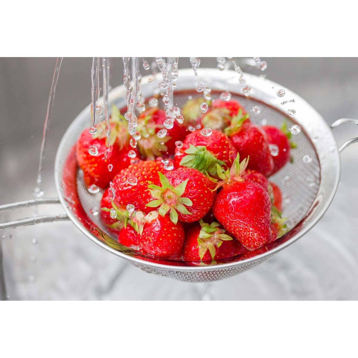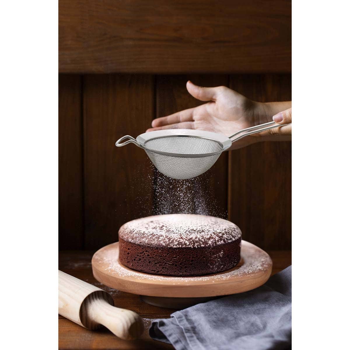 HIC Kitchen's Double Mesh Strainer drains, sieves, aerates, and sifts ingredients for smooth textures and fluffy baking without clumps or lumps. The helper handle sits securely on pots and pans, mixing bowls, and containers for extra stability during use so hands are kept free for measuring, pouring, and food preparation. The fine mesh sieve extracts seeds, skins, fibrous bulk, and small bits for smooth consistencies and creamy textures in soups and sauces, pastes and purees without lumps. This versatile food strainer and kitchen accessory rinses legumes, rice, and grains, catches seeds and pulp from fresh lemons, drains and strains herb infusions or mulling spices, and sifts flour, confectioners' sugar, and other powdered ingredients that settle and compact during shipping. Size: 5"