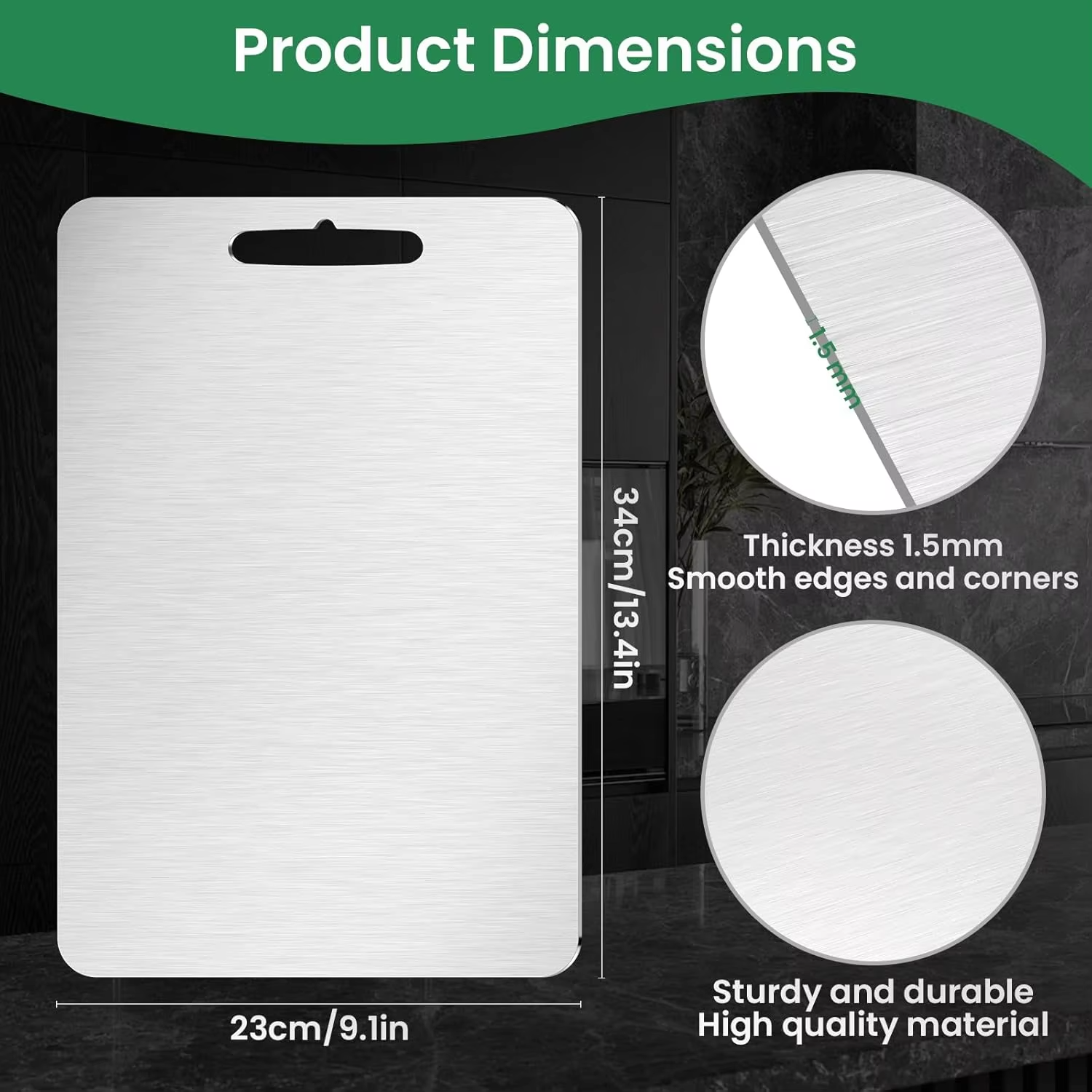 Sturdy and Durable: Titanium cutting boards are extremely sturdy and durable, resisting cuts, grooves and punctures. The ruggedness ensures that your cutting board is long lasting and smooth and hygienic. Remove the common defects of ordinary cutting boards, brand new design titanium cutting board. Durable and Crack-Resistant:Say goodbye to cracks and splits! The meat cutting board is built for heavy use, food and liquids won't stick to the surface, simply rinse with water, and it dries instantly Knife-Friendly Surface:Protect your knives with our dishwasher safe cutting boards! Its ideal hardness ensures smooth cuts while keeping your blades sharp and intact Stable and Versatile Design: Enjoy a stable cutting experience with our double sided cutting board. Its double-sided design helps separate ingredients, and the handy handle makes cutting board metal easy to move, store, and hang, keeping your kitchen tidy.