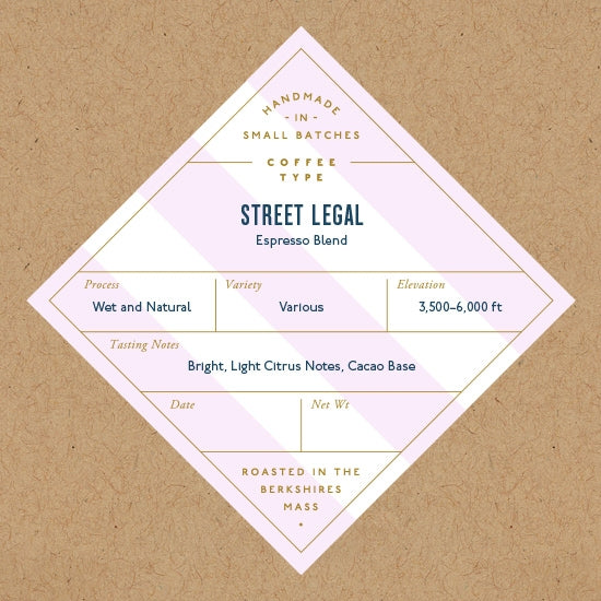 Street Legal Espresso: A modern "west coast" espresso with brighter notes from the addition of African coffees to our classic espresso blend.