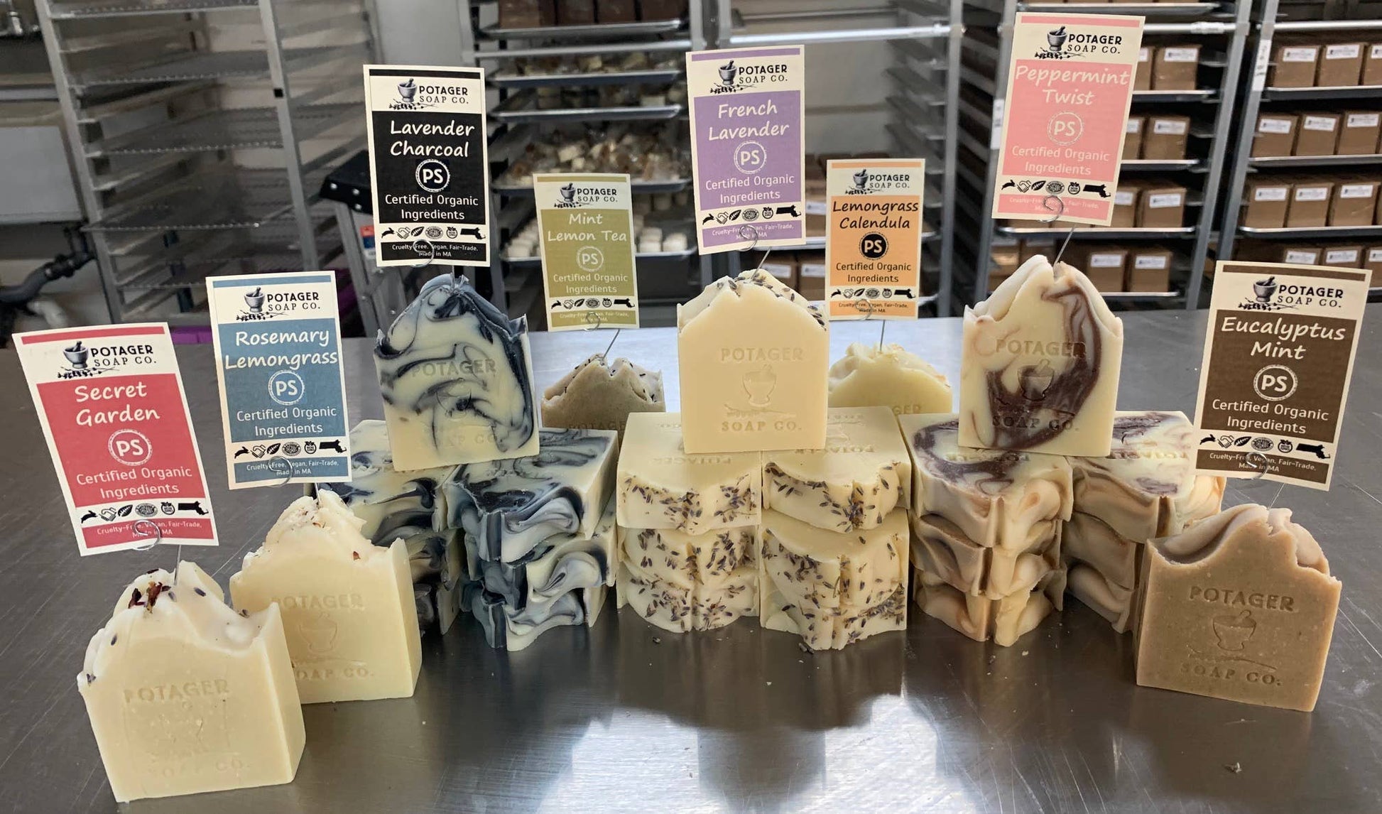 Potager’s holiday Orange Spice Soap is a festive, handcrafted bar wrapped for cozy gifting. Blooming with organic sweet orange essential oil, warmed by organic cinnamon and clove essential oils, it smells like a winter kitchen and feels like a fireside escape. The soap is made with a creamy base of organic high oleic sunflower oil, organic coconut oil, organic RSPO palm oil, and organic shea butter, creating a gentle yet thorough cleansing lather perfect for cold-weather skin. Each bar is drizzled in cinnamon glaze, wrapped in letter-pressed recycled paper, tied with natural twine, and sealed with a wax stamp, making it picture-perfect for seasonal displays. It’s a bar that awakens the senses, brightens the bath, and summons that #SpicedWinterGlow with every use.